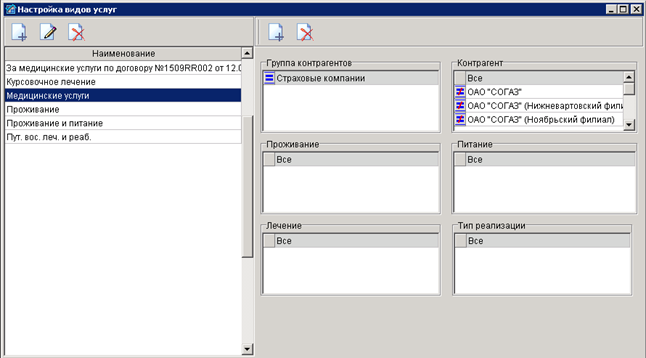 Справочник «Настройка видов услуг» служит для определения типа услуги по совокупности данных о заезде и контрагенте. Необходимо занести все имеющиеся типы услуг и определить критерии, по которым предоставляемый конкретному пациенту набор услуг будет относиться к тому или иному результирующему виду услуги.