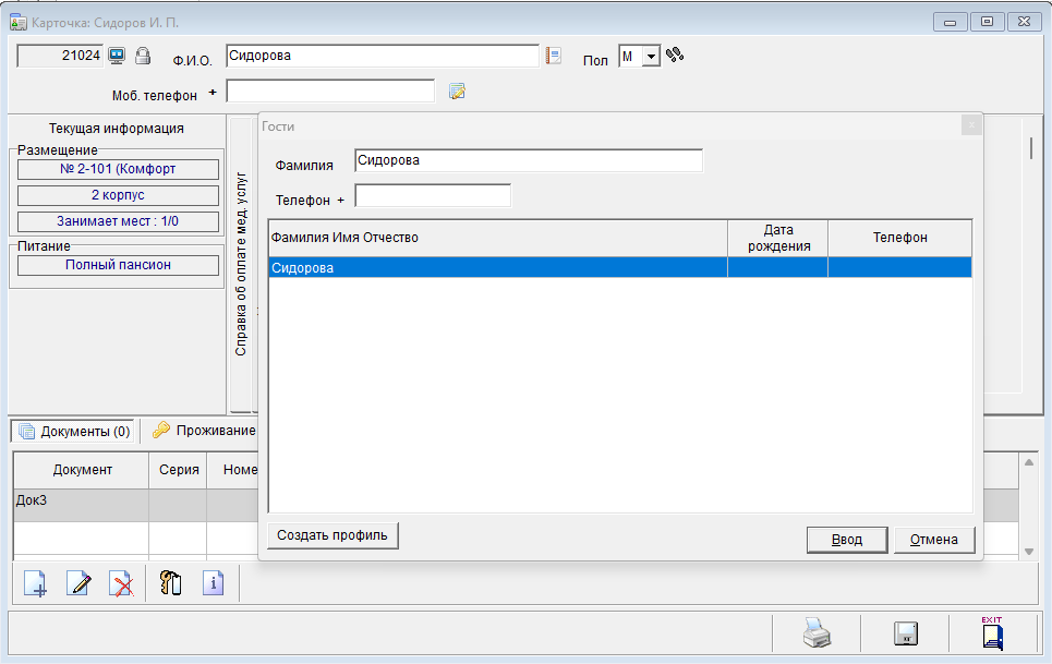 вариант б: Если в карточке гостя поле «Моб. телефон» было пустое, то в списке профилей нужно выбрать профиль и нажать «Ввод». Если подходящий профиль не найден, нужно нажать кнопку «Создать профиль». Новый профиль создаётся только при полном сохранении карточки
