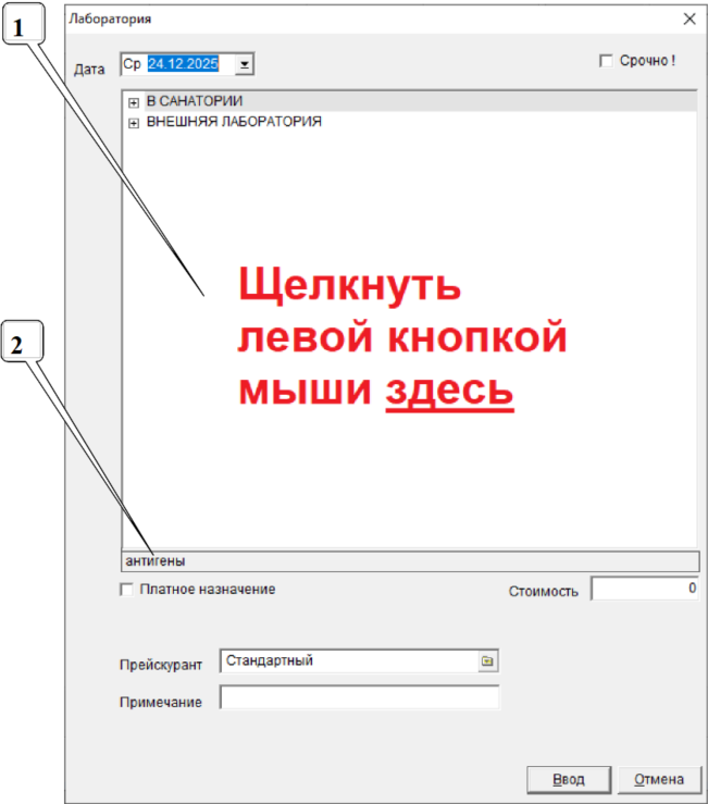 Для назначения платных лабораторных исследований, необходимо перед выбором наименований исследований установить галку