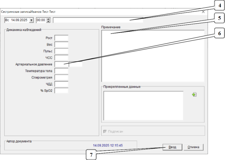 6. Слева при необходимости ввести антропометрические данные (АД, пульс, температуру).