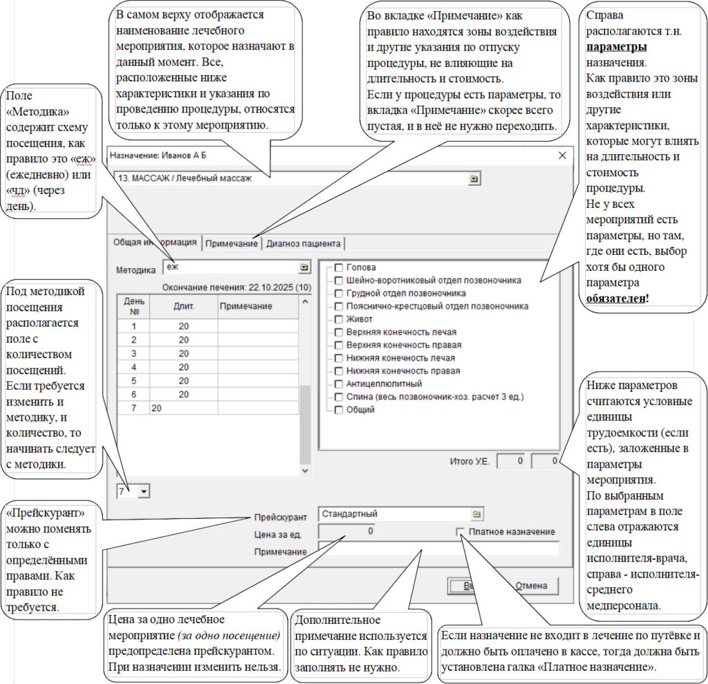 лечебные мероприятия для ввода дополнительных указаний, таких как зоны воздействия, методика посещений, количества посещений и т.п.