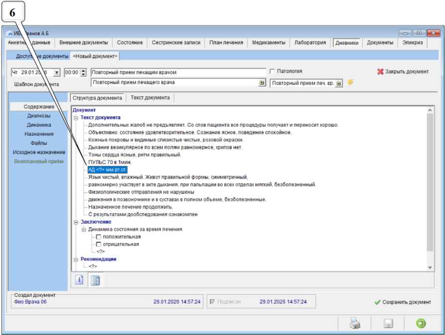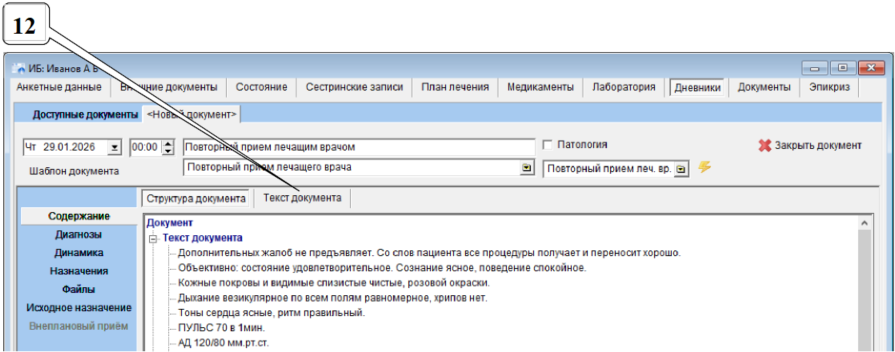 Далее показн порядок заполнения повторного приема по краткому шаблону. Содержание шаблона зависит от настроек на объекте и может отличаться от приведенного примера. Общие приемы работы с шаблонами документов описаны здесь.