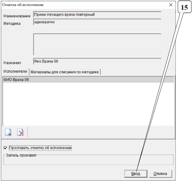15. Нажать на кнопку «Ввод», чтобы установить отметку о выполнении врачебного приема (окно не появится, если в «Обработке посещений» отметка о выполнении image.png была проставлена ранее).