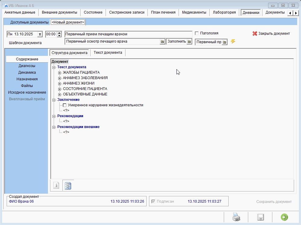 Заполнение первичного приема лечащего врача по шаблону (с переходом в "Текст документа" после заполнения по "Норме" и коррекции по шаблону)
