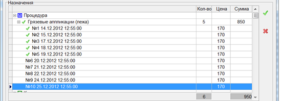 8. Если требуется принять оплату только за часть процедур, необходимо Выделить процедуру, которую не следует включать в чек и нажать «Пробел» на клавиатуре – галка