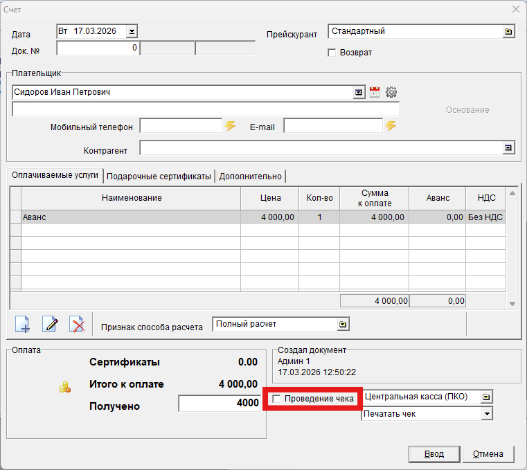 За проведение отвечает признак «Проведение чека»: