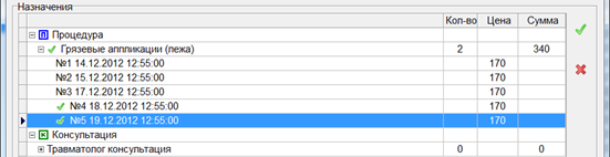 8. Появится перечень оплаченных и еще невыполненных мероприятий выбранного получателя услуг. Необходимо нажать на наименование возвращаемой процедуры, а затем нажать на клавиатуре «Пробел». Слева от наименования появится зеленая галка