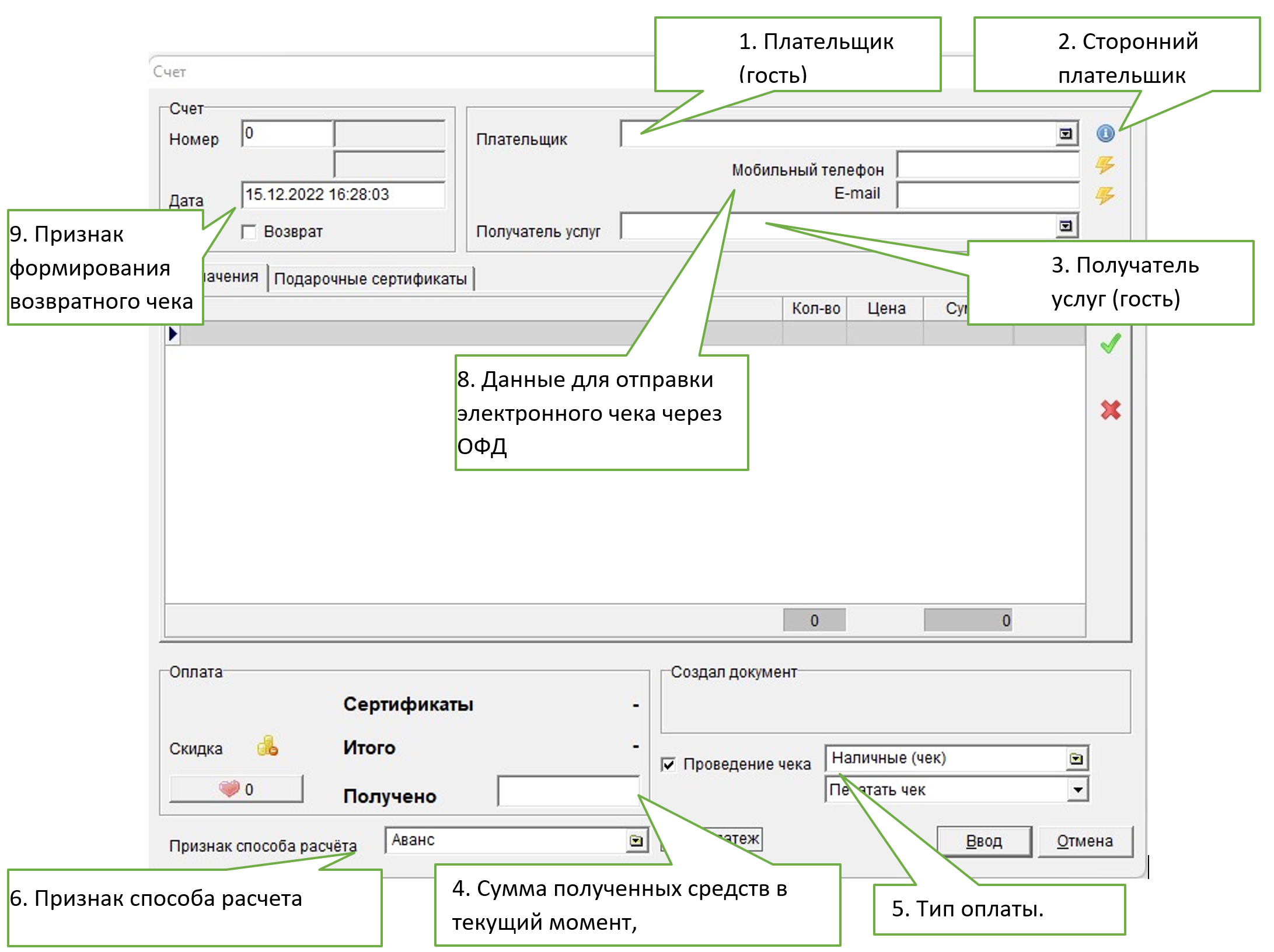 10. Проверить тип оплаты (рисунок из п. 5, п. 5) -"Фискальный регистратор" используется при возврате наличных и "Банковский терминал" при возврате на карту.