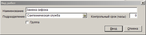 Список работ является иерархическим. запись в справочнике может быть либо группой, либо элементом. Каждая запись (как группа, так и конечная работа) принадлежит определенному подразделению (в соответствии с этим признаком определяется возможность доступа к элементу справочника работ). Работа может иметь контрольный срок исполнения, задающийся в часах, который затем может использоваться в отчетности.