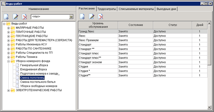 В справочнике "Виды работ" хранится список работ (столбец слева), если работы выполняются по расписанию, настраивается их периодичность (столбец справа, закладка «Расписание»), трудоемкость в минутах (столбец справа закладка «Трудозатраты») и подлежащие списанию при выполнении данной работы материалы.