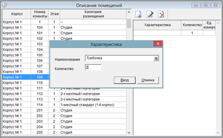 Справочник «Описание помещений» содержит сведения об установленном оборудовании и иных характеристиках помещений. Справочник представляет собой связь между справочником помещений (комнат) и справочником «Оборудование и характеристики помещений». Связь имеет количественную характеристику: