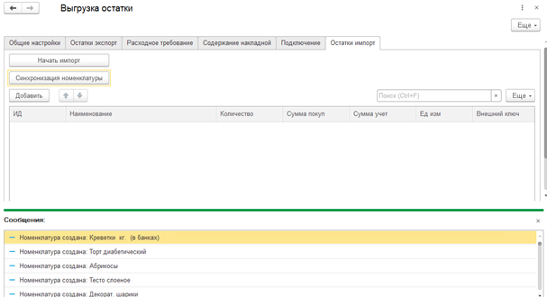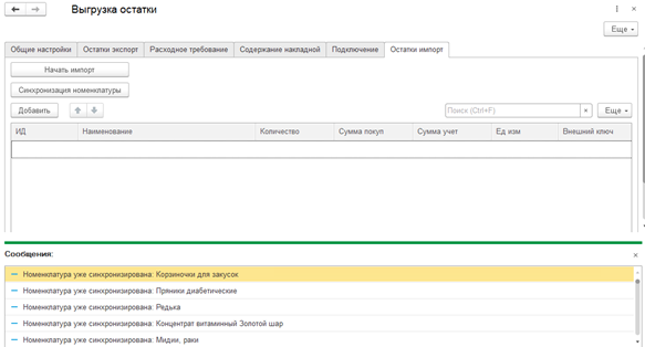 После этого можно загружать расходные требования и остатки из СПК «Здравница» в 1С: БП. Происходит проверка по внешнему коду, если выгружаемая номенклатура с внешним кодом выгружается повторно, и эта номенклатура уже заведена в справочнике «Номенклатура», то по каждому такому продукту выводится сообщение «Номенклатура уже синхронизирована» + «Наименование номенклатуры»: