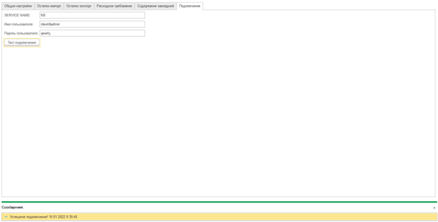 Необходимо ввести учетные данные сотрудника в СПК «Здравница», имя службы базы данных, логин и пароль пользователя. Для проверки соединения необходимо нажать на кнопку «Тест подключения» При успешном подключении появится сообщено «Успешное подключение!». При неудачной попытке соединения, будет выведено сообщение с описанием ошибки.
