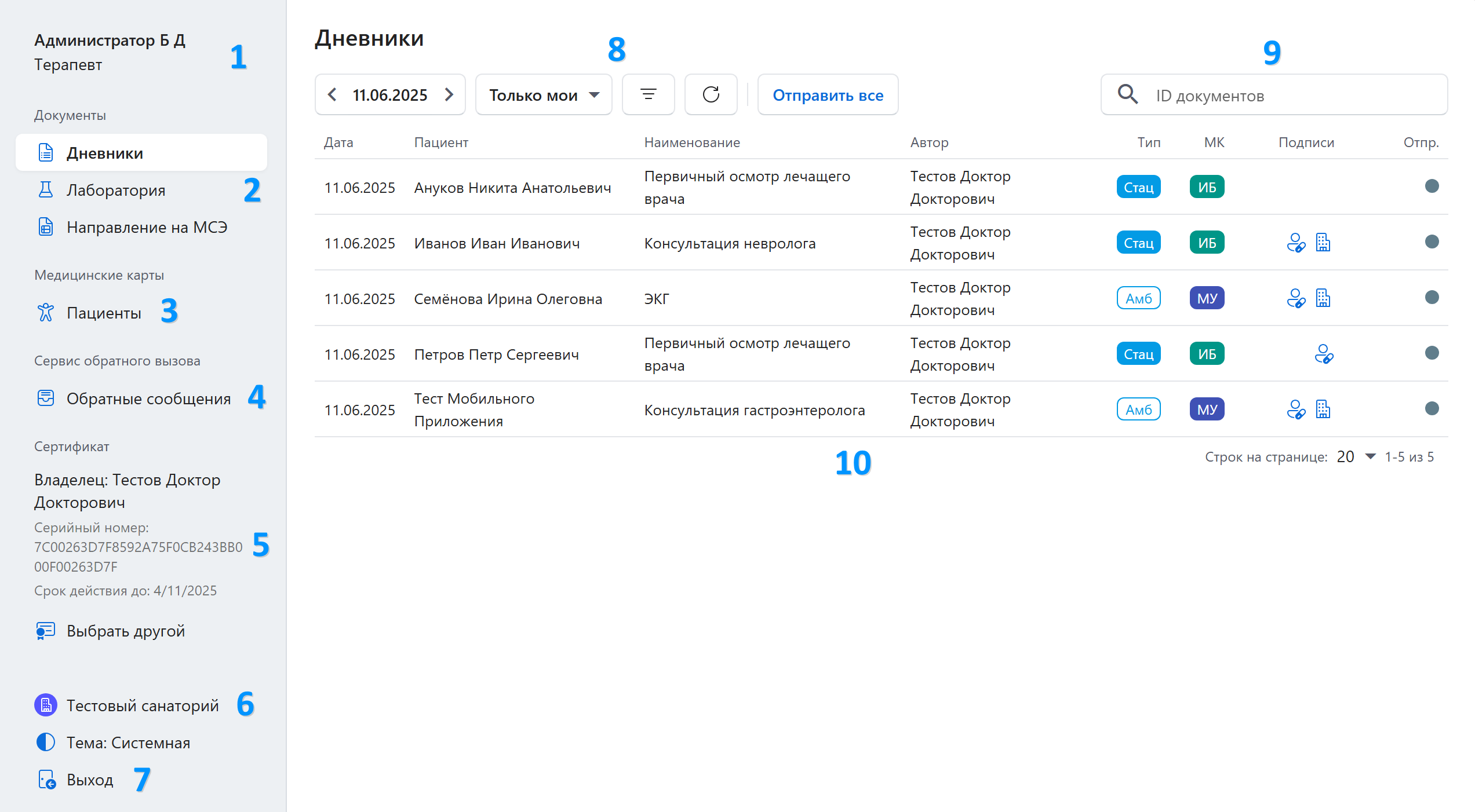 2. Группа меню с медицинскими документами по их источникам (дневники, лабораторные исследования и т.д.).