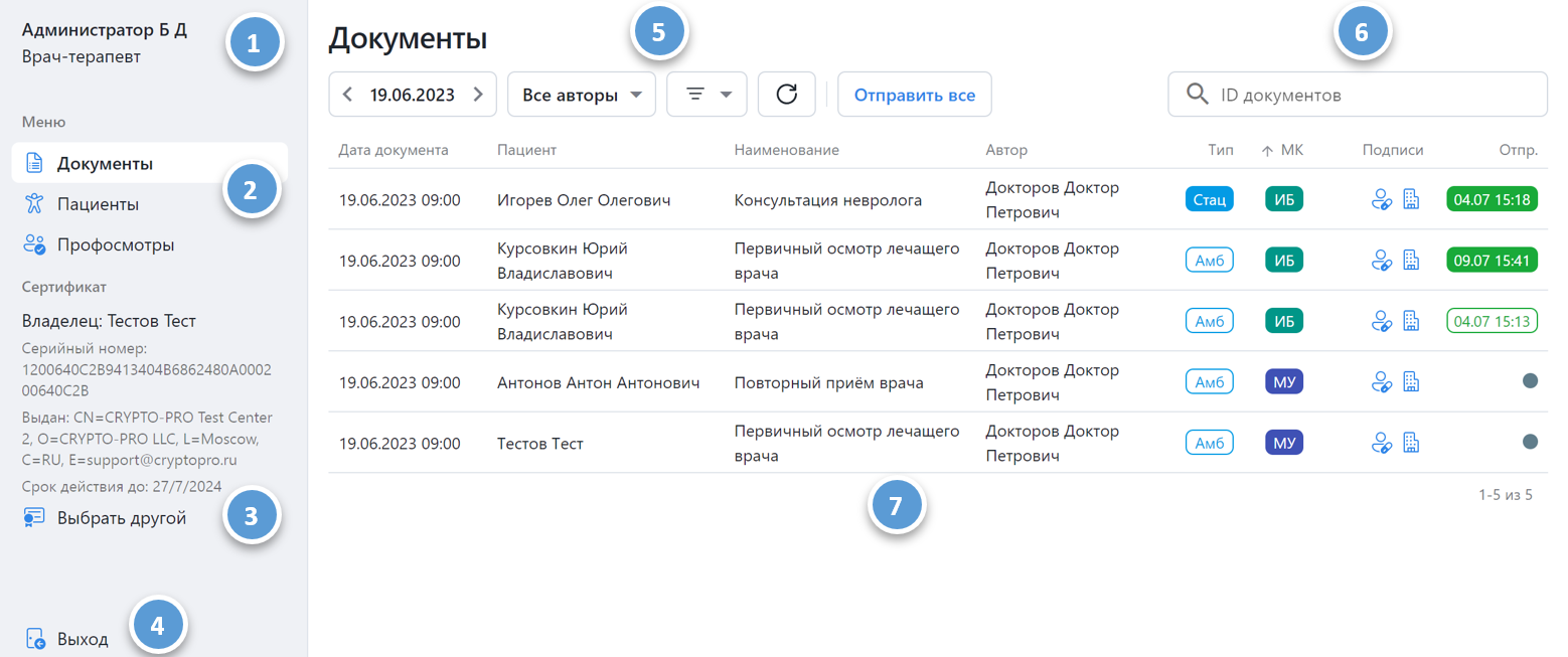2. Боковая панель с выбором разделов «Документы», «Пациенты» или «Профосмотры» (при наличии модуля).