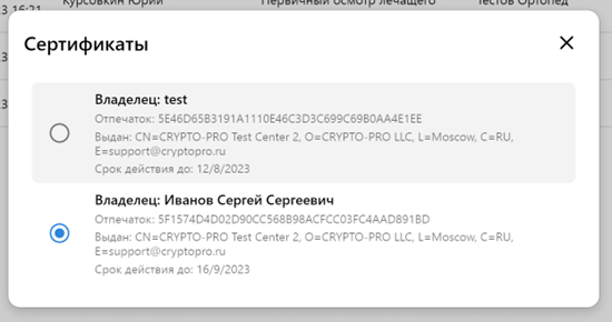 3.5. Выбор сертификатов, которым пользователь будет подписывать документ. При нажатии на кнопку «Выбрать» пользователю будет предложено выбрать сертификат в модальном окне.