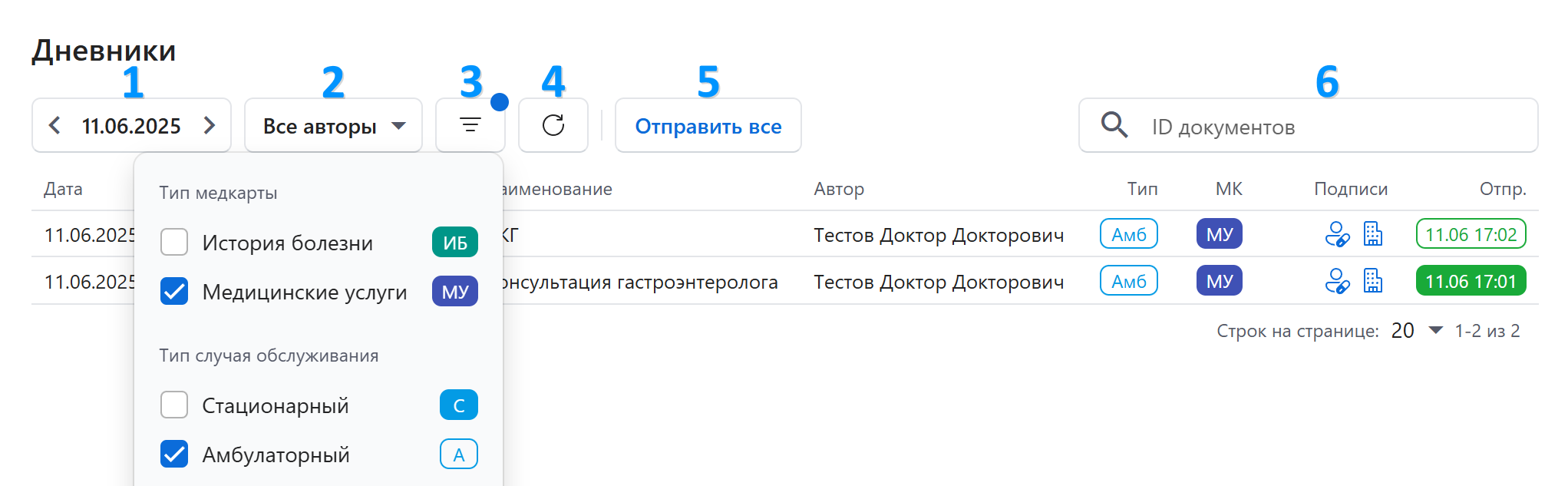 Отбор документов осуществляется по дате создания документа (1), автору документа (2) и другим фильтрам (3), например, по типу медицинской карты, статусу подписания и отправки.