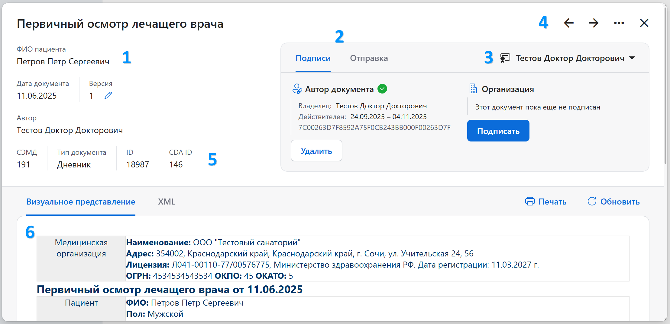 В центральной части формы выводится сам документ (5). Вы можете выбрать как привычный печатный вид (вкладка «Визуальное представление»), а так и XML (вкладка «XML»), который будет отправлен в ЕГИСЗ. Визуальное представление опирается на сформированный XML.