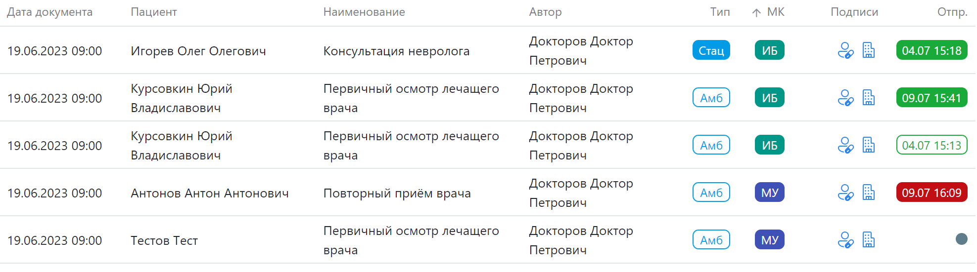 • Подписи – наличие синих значков означает, что документ подписывался: «человек с пилюлей» – врачом, «здание» – организацией. Отсутствие того или иного значка – отсутствие соответствующей значку подписи.