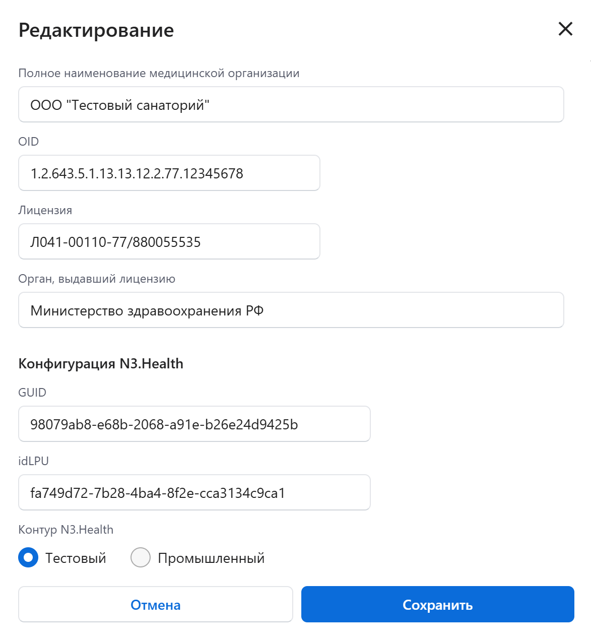 В группе Конфигурация N3.Health также необходимо заполнить GUID и idLPU, предоставленные вам N3.Health, а также указать, к какому контуру эти ключи относятся – тестовому или промышленному. Обратите внимание, что для промышленного контура N3.Health предоставляет новые ключи.