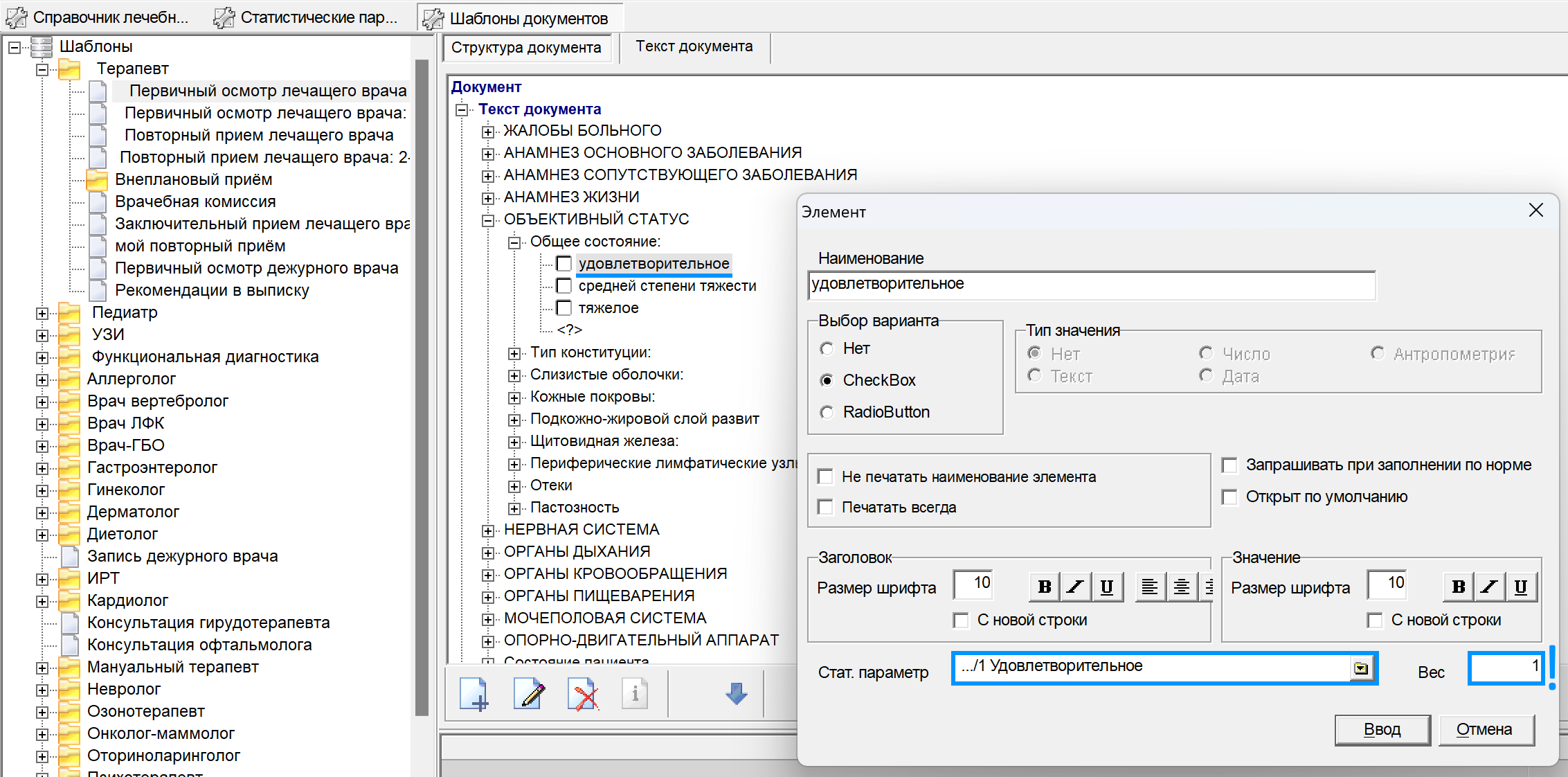 В шаблонах документов, где могут подразумеваться состояния, отличные от удовлетворительного, нужно будет либо добавить соответствующие элементы в виде чекбокса или радиокнопки, либо привязать уже имеющиеся элементы к новым статистическим параметрам, указав вес отличный от нуля, например, 1.
