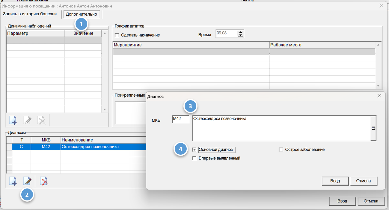 - Вкладка «Дополнительно» («Диагнозы», если включен альтернативный вид дневников);