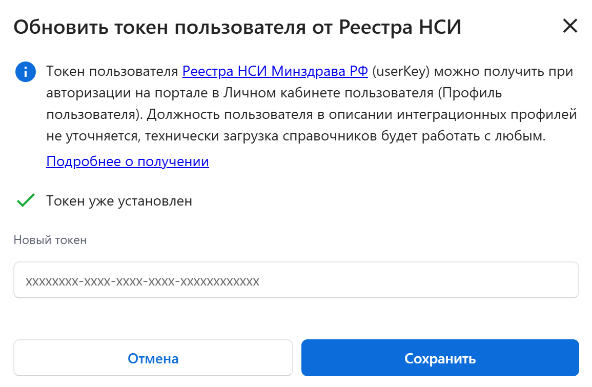 Токен пользователя для загрузки справочников из Реестра НСИ