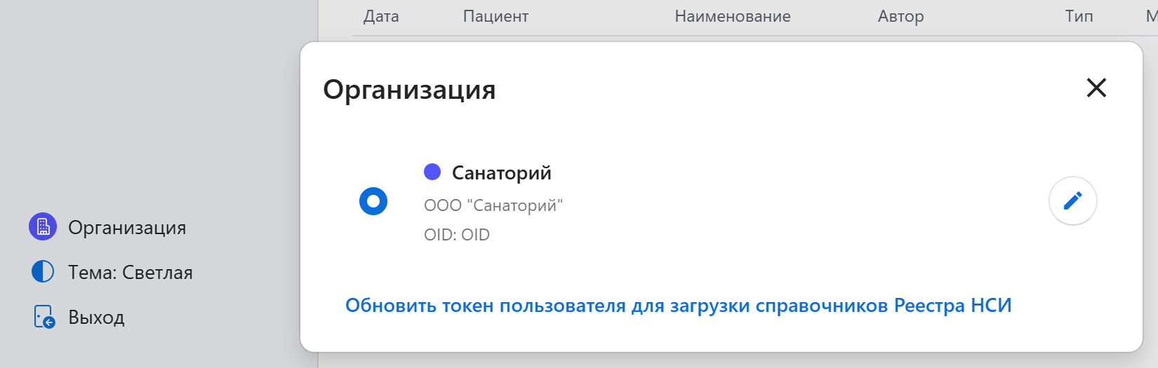 Полученный токен также указывается в веб-интерфейсе интеграции: в боковой панели нажмите на Организация (или название вашего санатория), затем в нижней части открывшегося окна Обновить токен пользователя.